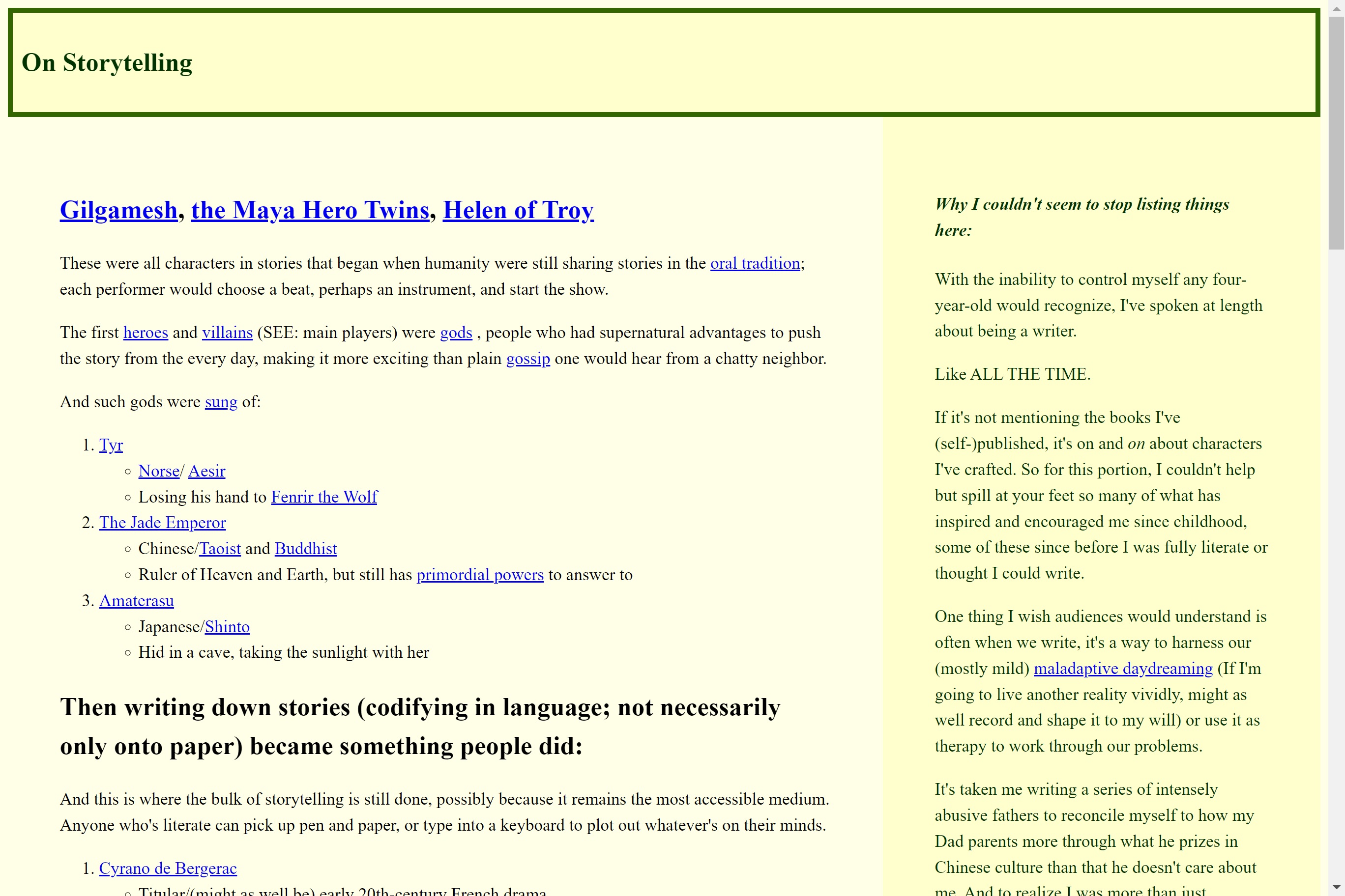 This was one part of five where I chatted about my opinions concerning art. For this Storytelling page, I outlined a history of stories through the ages, and the types of characters featured. I devoted a section to the graphic novel, then concluded with movies featuring characters born normal but found opportunities to be extraordinary. The page is studded with hyperlinks to outside sources for further explanation or description. The stories discussed spanned multiple cultures, languages, and media.